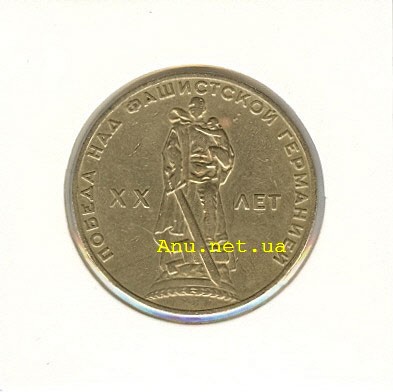 В середине поля изображение монумента “Воин-освободитель” в Трептов-парке в Берлине. По сторонам изображения: слева дата “ХХ”, справа слово “ЛЕТ”. Вдоль внешнего ободка, окаймляющего монету, с внутренней стороны надпись по окружности “ПОБЕДА НАД ФАШИСТСКОЙ ГЕРМАНИЕЙ”.