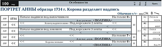 Например, по предыдущим редакциям пользователям приложения-ценника известен довольно редкий тип 100 – серебряная полтина 1734 г. с сетчатым гуртом и с портретом Анны на лицевой стороне, где корона разделяет надпись между словами IМПЕРАТРИЦА и IСАМОДЕРЖ. В приложении для данного типа выделена единственная разновидность № 1 (Кон.100/1), средняя цена которой для состояния VF составляет 2 500 долларов США.