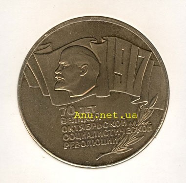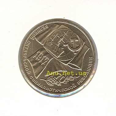 В центре группа революционных гвардейцев - крестьянин, рабочий и солдат.Над ними дата "1917". Вдоль внешнего ободка монеты полукругом расположена надпись "СЕМЬДЕСЯТ ЛЕТ ВЕЛИКОЙ ОКТЯБРЬСКОЙ СОЦИАЛИСТИЧЕСКОЙ РЕВОЛЮЦИИ".