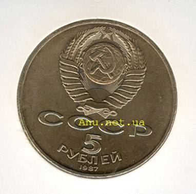 Для чеканки монеты использовался вариант шт.I(5 р.).1, выполненный под диаметр монеты 39 мм, с датой "1987" и имеющий, в отличие от монет с номиналом "1 рубль" и от 5-рублевых монет последующих годов чеканки, длинную ость, выступающую из-под верхнего витка перевязывающей ленты в гербе.