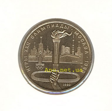 В середине поля на заднем плане силуэты Кремля, высотных зданий Москвы, здания СЭВ и Останкинской телебашни. Внизу круг стадиона, от которого вверх поднимается рука, сжимающая олимпийский факел. Справа внизу - дата чеканки монеты "1980". Слева от факела эмблема Олимпиады-80. С внутренней стороны вдоль внешнего ободка монеты расположена надпись: "ИГРЫ XXII ОЛИМПИАДЫ. МОСКВА. 1980".