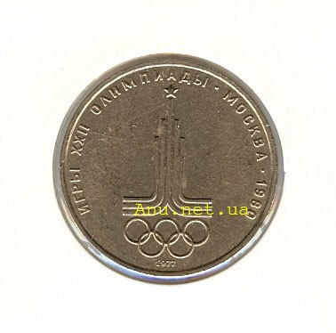 В середине поля эмблема Московской Олимпиады, под ней дата выпуска монеты "1977". С внутренней стороны вдоль внешнего ободка монеты расположена надпись: "ИГРЫ XXII ОЛИМПИАДЫ. МОСКВА. 1980".