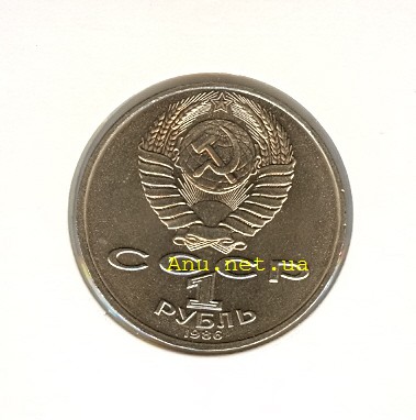 Шт.VI.1. Дата чеканки "1986". Параллели и меридианы на земном шаре в гербе вогнутые. Зерна второго левого колоса с внутренней стороны с длинными остями. Верхние ости вторых и третьих колосьев справа и слева длинные. Цифра "1" номинала приближена к третьей букве "С" в слове "СССР". Буква "Л" в слове "РУБЛЬ" сверху без горизонтальной полочки (такая же, как в типах IV и V). Герб и дата удалены от внешнего ободка монеты.