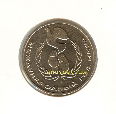 В центре рельефное изображение эмблемы Международного года мира. Вдоль внешнего ободка монеты полукругом расположена надпись "МЕЖДУНАРОДНЫЙ ГОД МИРА".