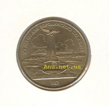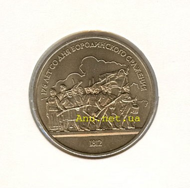 Шт.Б. В центре фрагмент памятника фельдмаршалу М.И.Кутузову в Москве - барельеф с группой участников войны 1812 года. Под ним дата "1812". Вверху вдоль внешнего ободка монеты полукругом надпись "175 лет СО ДНЯ БОРОДИНСКОГО СРАЖЕНИЯ".