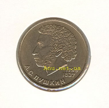 В центре профильный портрет поэта, повернутый влево. Справа и ниже в две строки годы жизни "1799" и "1837". Внизу вдоль внешнего ободка монеты полукругом надпись "А.С.ПУШКИН".