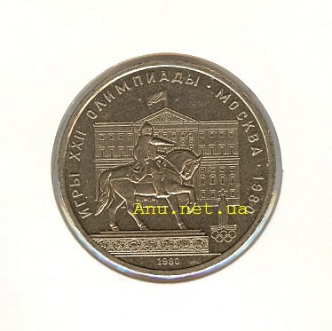 В середине поля памятник Юрию Долгорукому. На втором плане - здание Моссовета. В нижнем сегменте под памятником - дата чеканки монеты "1980". Справа внизу эмблема Олимпиады-80. С внутренней стороны вдоль внешнего ободка монеты расположена надпись: "ИГРЫ XXII ОЛИМПИАДЫ. МОСКВА. 1980".