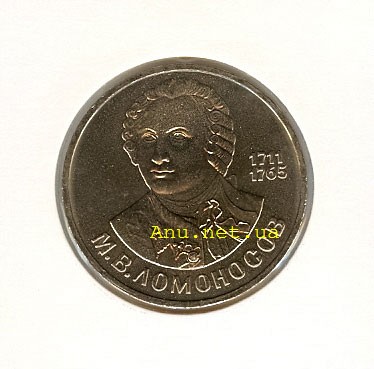 В центре погрудный портрет ученого. Ниже вдоль внешнего ободка монеты полукругом надпись "М.В.ЛОМОНОСОВ". Справа друг под другом годы жизни "1711" и "1765".