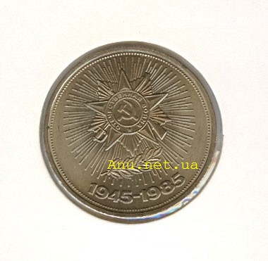 На фоне лучей рельефное изображение ордена Отечественной войны и лавровой ветви. Под ними полукругом даты "1945 - 1985". Вдоль внешнего ободка монеты по всему периметру расположен орнамент из точек.