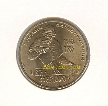 В центре фрагмент памятника Ивану Федорову в Москве. Справа от него годы жизни "1510" и "1583", расположенные друг под другом. Внизу ступенькой расположен текст "ИВАН ФЕДОРОВ". Сверху вдоль внешнего ободка монеты полукругом расположен текст "РУССКИЙ ПЕРВОПЕЧАТНИК".