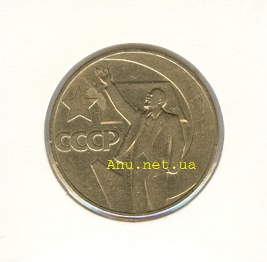 В средней части изображение Государственного герба Союза Советских Социалистических Республик. В нижней части в две строки надпись "ПЯТЬДЕСЯТ КОПЕЕК", обозначающая достоинство монеты. По окружности надпись "ПЯТЬДЕСЯТ ЛЕТ СОВЕТСКОЙ ВЛАСТИ" и выступающий кант.