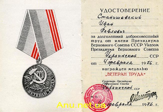Медаль “Ветеран труда” учреждена для награждения трудящихся за долголетний добросовестный труд в народном хозяйстве, в области науки, культуры, народного образования, здравоохранения, в государственных учреждениях и общественных организациях. Медалью награждаются рабочие, колхозники и служащие в знак признания их трудовых заслуг по достижении трудового стажа, необходимого для назначения пенсии за выслугу лет или по старости.