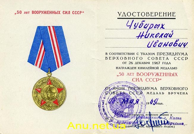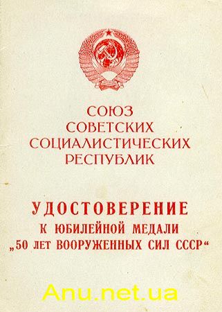Вручение юбилейной медали “50 лет Вооруженных Сил СССР” производится от имени Президиума Верховного Совета СССР: