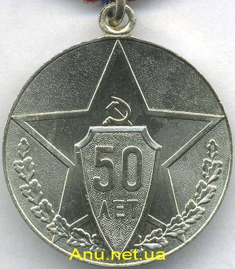 На лицевой стороне медали помещено изображение звезды, в верхнем луче которой расположены серп и молот. В средней и нижней части звезды изображен щит с матовой поверхностью и рельефной надписью “50 ЛЕТ”. В нижней части медали по окружности – рельефное изображение дубовых ветвей.