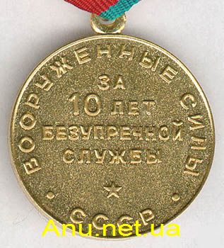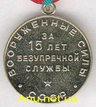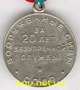 На реверсе по окружности расположены надписи: в верхней части реверса - “ВООРУЖЕННЫЕ СИЛЫ”, в нижней части - “СССР”. Надписи разделены рельефными точками. В центре реверса расположена надпись “ЗА 20 (15, 10) ЛЕТ БЕЗУПРЕЧНОЙ СЛУЖБЫ”. Надпись расположена горизонтально в четыре строки, под надписью – маленькая пятиконечная звездочка.