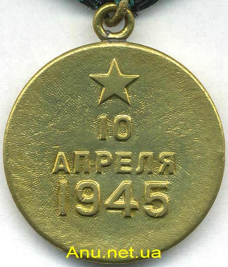 На оборотной стороне медали дата взятия Кенигсберга: “10 апреля 1945”, над датой пятиконечная звездочка.