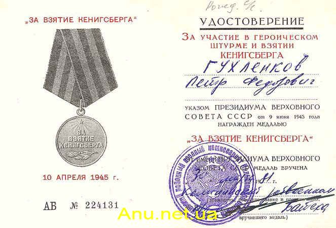 Указом Президиума Верховного Совета СССР от 5 февраля 1951 года установлено, что медаль “За взятие Кенигсберга” и удостоверение к ней в случае смерти награжденного оставляются в его семье для хранения как память. До появления данного Указа сама медаль и удостоверение к ней после смерти награжденного возвращались государству.