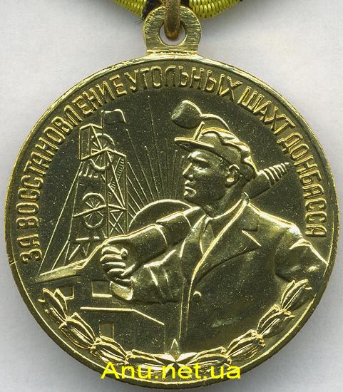Медалью “За восстановление угольных шахт Донбасса” награждаются рабочие, служащие, инженерно-технические и хозяйственные работники за выдающуюся работу, высокие производственные показатели и заслуги в восстановлении угольной промышленности Донбасса.