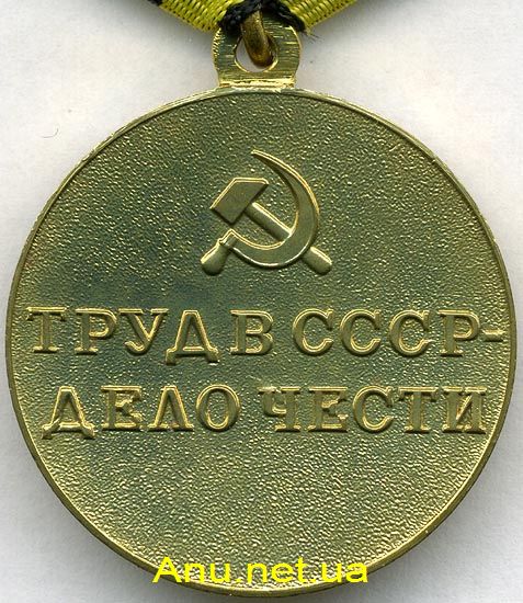 На оборотной стороне медали в две строки надпись “ТРУД В СССР - ДЕЛО ЧЕСТИ”. Над надписью рельефное изображение серпа и молота.
