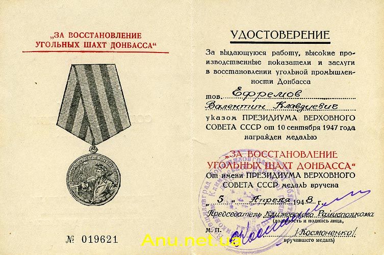 Вручение медали “За восстановление угольных шахт Донбасса” производится от имени Президиума Верховного Совета СССР исполнительными комитетами областных Советов депутатов трудящихся по месту жительства награжденных.
