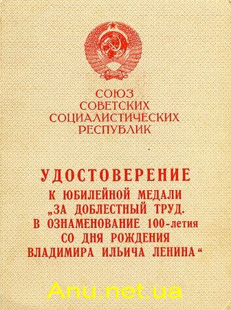 • Вариант 1. В левой части удостоверения вверху и в правой части удостоверения в центре красным шрифтом надпись “За доблестный труд. В ознаменование 100-летия со дня рождения Владимира Ильича Ленина”.