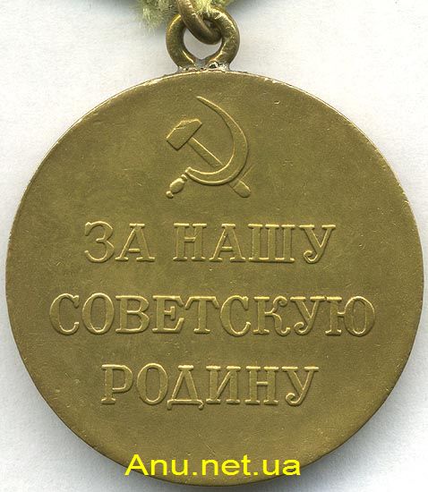 На оборотной стороне медали надпись “ЗА НАШУ СОВЕТСКУЮ РОДИНУ”. Над надписью изображены серп и молот.