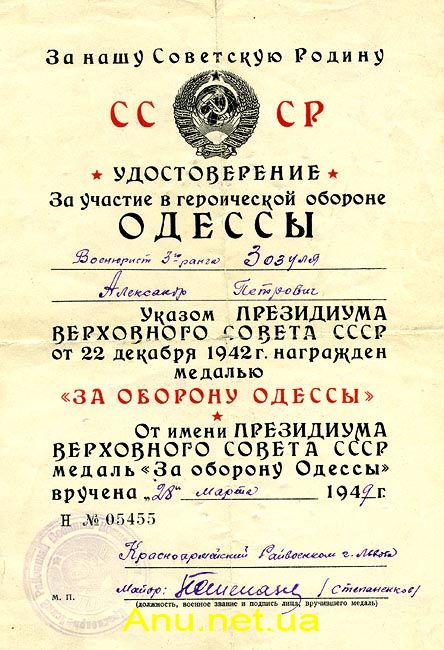 - лицам из гражданского населения - участникам обороны Одессы - областными и городскими Советами депутатов трудящихся по месту жительства награжденных.