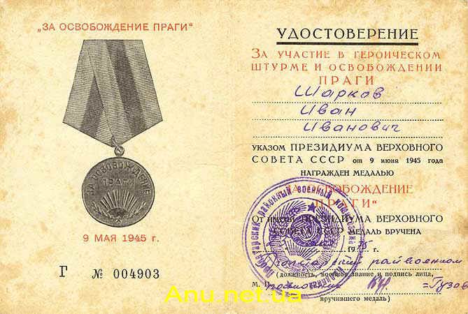 Указом Президиума Верховного Совета СССР от 5 февраля 1951 года установлено, что медаль “За освобождение Праги” и удостоверение к ней в случае смерти награжденного оставляются в его семье для хранения как память. До появления данного Указа сама медаль и удостоверение к ней после смерти награжденного возвращались государству.