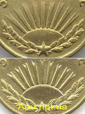 Коллекционер Роман Сливин отметил различия штампа медалей первого и второго вариантов. Различия особенно заметны при сравнении лучей, а также лавровых веточек и звездочки в нижней части аверса медали. Более ранние медали имели нераздваивающиеся лучи, сглаженные листья венка и гладкую поверхность звездочки (верхнее фото). На более поздних медалях лучи раздваивались, листья венка имели четко выраженные прожилки, на лучах звезды хорошо заметны грани (нижнее фото).