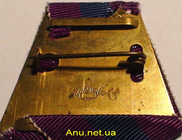Медаль при помощи ушка и кольца соединяется с пятиугольной колодочкой, обтянутой сиреневой шелковой муаровой лентой шириной 24 мм. Посередине ленты синяя полоска шириной 8 мм [2].