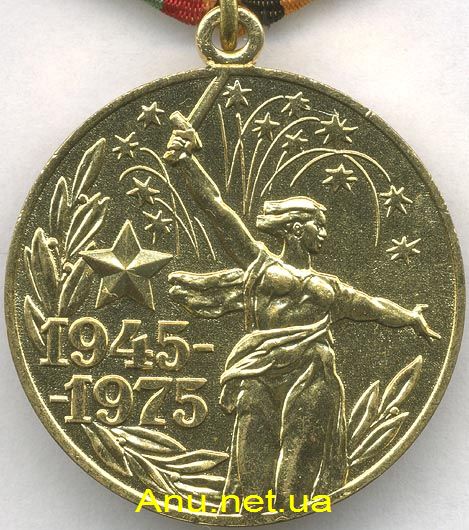 На лицевой стороне медали на фоне праздничных огней салюта в честь Победы советского народа в Великой Отечественной войне расположено рельефное изображение скульптуры Вучетича Е.В. “Родина-Мать” из памятника-ансамбля героям Сталинградской битвы. Слева от скульптуры на лавровой ветви, опускающейся вниз, изображены пятиконечная звезда и дата “1945-1975”.