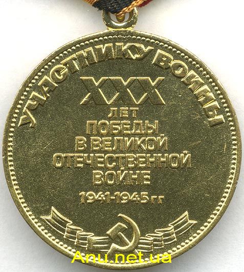 На оборотной стороне медали размещены: в верхней части по окружности надпись “УЧАСТНИКУ ВОЙНЫ” или “УЧАСТНИКУ ТРУДОВОГО ФРОНТА”, в середине - надпись “ХХХ лет Победы в Великой Отечественной войне 1941-1945 гг.”, в нижней части - рельефное изображение серпа и молота на ленте.
