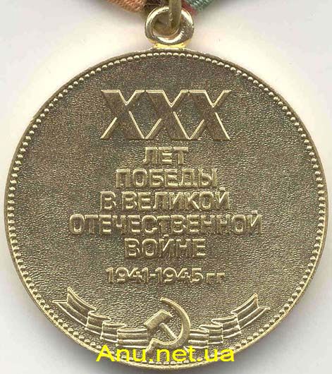 Медаль “Тридцать лет победы в Великой Отечественной войне 1941-1945 гг.” круглая, размером 36 мм в диаметре, изготовляется из латуни.
