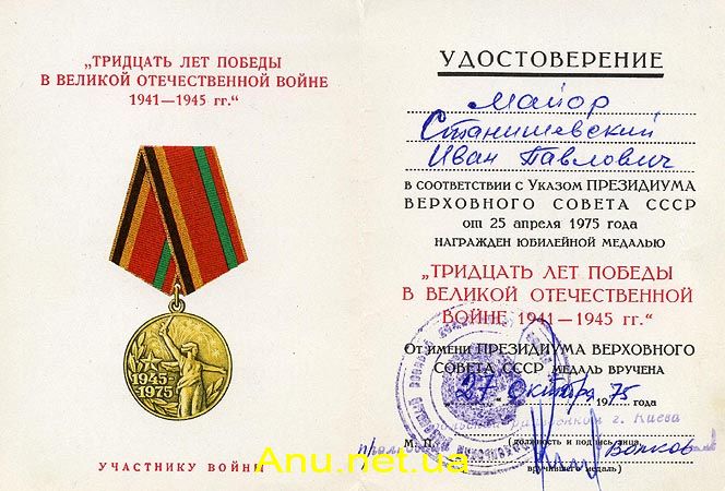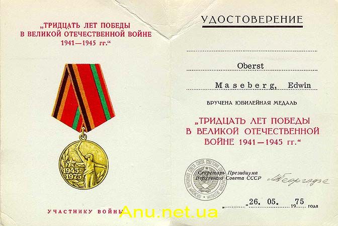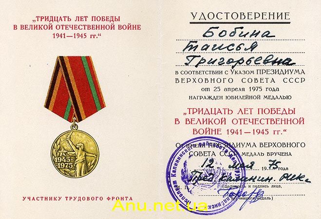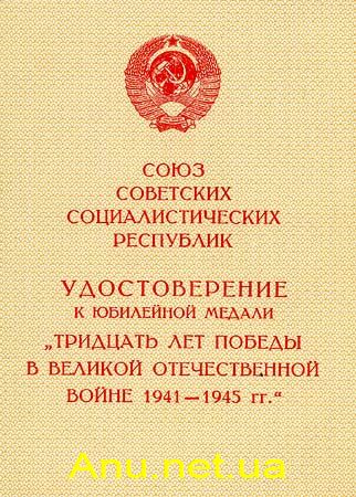Вручение юбилейной медали “Тридцать лет победы в Великой Отечественной войне 1941-1945 гг.” производится от имени Президиума Верховного Совета СССР:
