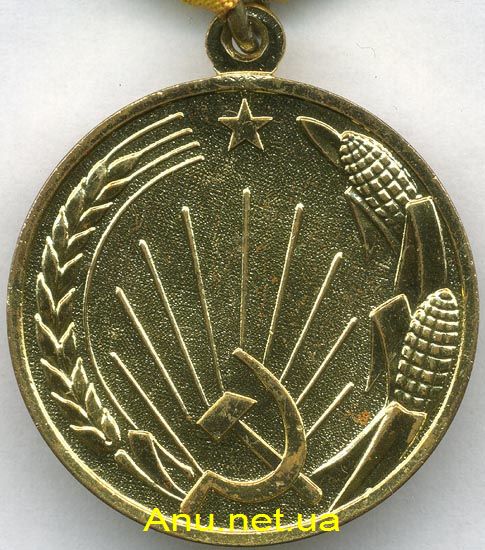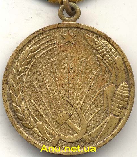 На оборотной стороне медали изображены: внизу серп и молот с расходящимися от них солнечными лучами, вверху пятиугольная звездочка, с левой стороны пшеничный колос и с правой стороны кукурузные початки.