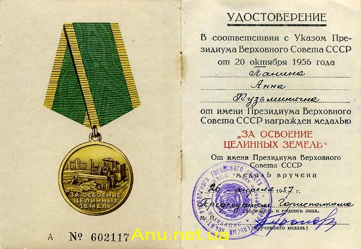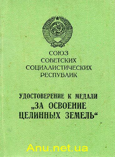 Удостоверение к медали "За освоение целинных земель"