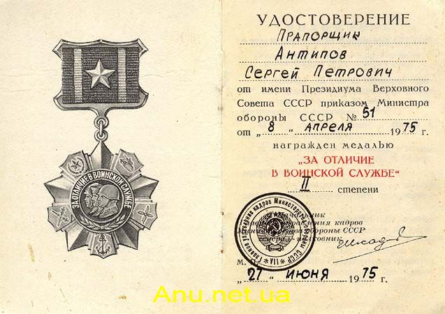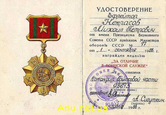 Удостоверение к медали “За отличие в воинской службе”, Вариант 1