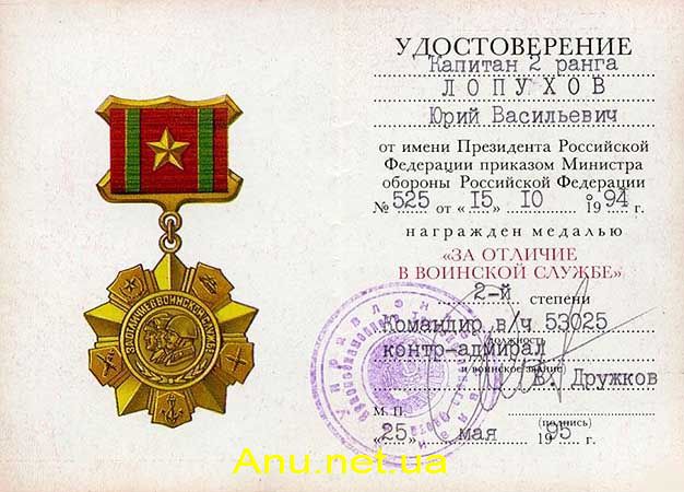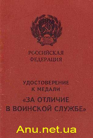 Удостоверение к медали “За отличие в воинской службе” Российской Федерации