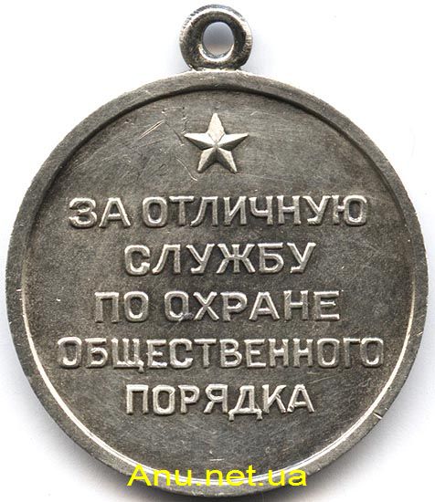 На лицевой стороне медали, в центре, надпись рельефными буквами в пять строк “За отличную службу по охране общественного порядка”. В верхней части медали изображена выпуклая пятиконечная звездочка.