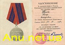 • за активное участие в охране общественного порядка и проявленные при этом храбрость и самоотверженность, активную борьбу с хулиганством, пьянством, хищением социалистической и личной собственности граждан, с нарушениями правил советской торговли, спекуляцией, самогоноварением и другими правонарушениями, приносящими вред обществу.