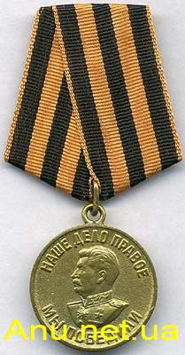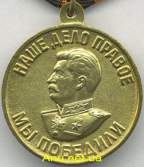 На лицевой стороне медали профильное погрудное изображение Сталина И.В. в форме Маршала Советского Союза, повернутое влево. В верхней части медали по окружности надпись “НАШЕ ДЕЛО ПРАВОЕ”, в нижней части по окружности надпись “МЫ ПОБЕДИЛИ”.