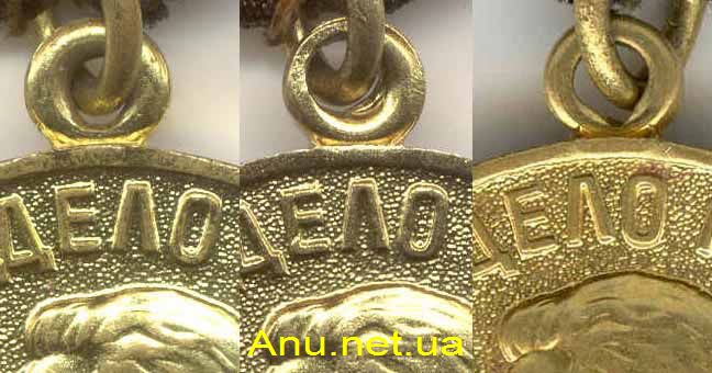 У медалей четвертого варианта отмечены три разновидности штампа, отличающиеся друг от друга взаиморасположением ушка и надписи вдоль верхнего края медали. На левом снимке геометрический центр ушка расположен между буквами Е и Л, на среднем снимке центр ушка расположен строго над буквой Л, а на снимке справа он находится между буквами Л и О.