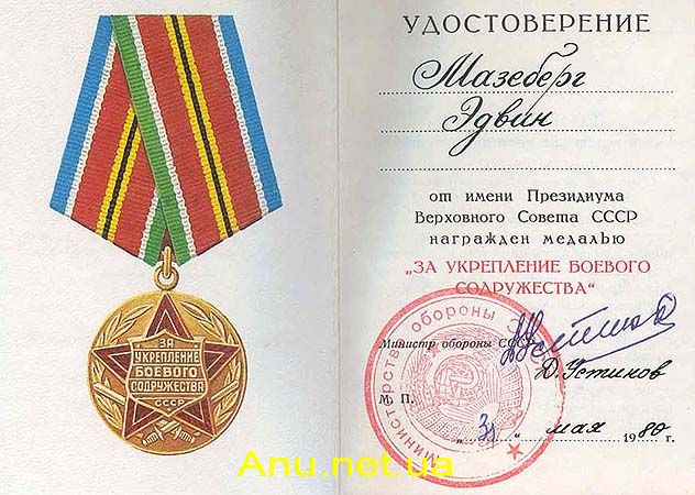 - Вариант 1. Удостоверение образца 1979 года. На правой стороне разворота отмечено, что награждение происходит "от имени Президиума Верховного Совета СССР". Ниже стоит подпись Министра оборны СССР.