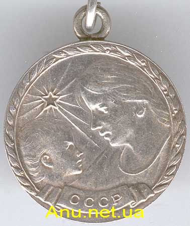 На лицевой стороне медали профильное погрудное изображение матери и ребенка. В левой верхней части медали выпуклая пятиконечная звездочка с расходящимися от нее лучами. По окружности медали узенький лавровый веночек.. В нижней части медали ленточка с надписью на ней “СССР”.