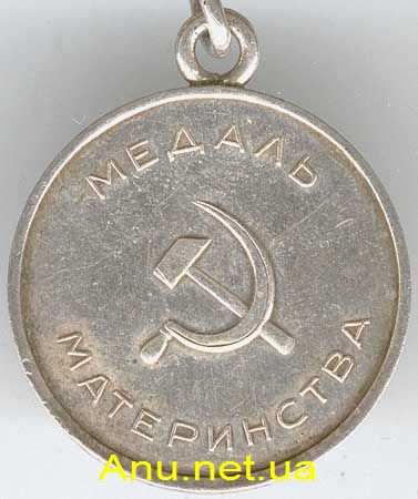 На оборотной стороне медали в центре изображение серпа и молота и надпись в верхней части по окружности “МЕДАЛЬ” и в нижней части по окружности – “МАТЕРИНСТВА”.