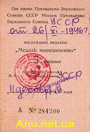 Первый Указ Президиума Верховного Совета СССР о награждении медалью был подписан 6 декабря 1944 года. Согласно этому Указу первой степенью медали были награждены 24 женщины, а второй степенью - 19 женщин [31].
