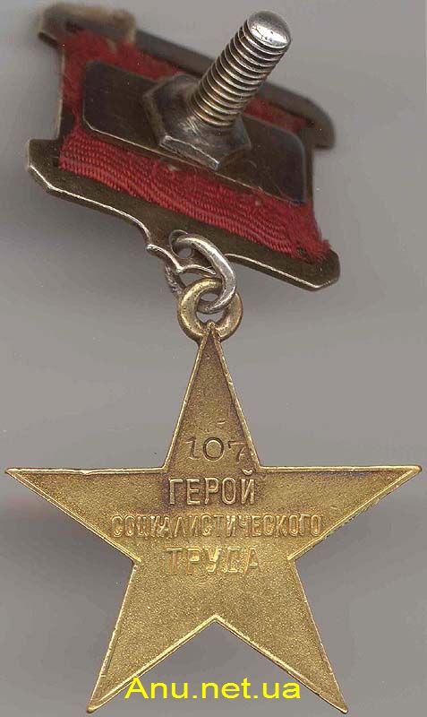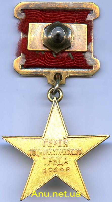 Оборотная сторона медали имеет гладкую поверхность и ограничена по контуру выступающим тонким ободком. На оборотной стороне в центре медали расположена надпись выпуклыми буквами “Герой Социалистического Труда”. Размер букв в словах “Герой” и “Труда” - 2 на 1 мм, в слове “Социалистического” - 1,5 на 0,75 мм. В верхнем луче расположен номер медали высотой в 1 мм.