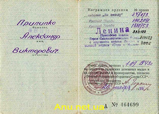 • Вариант 1. Самый ранний вариант, на Гербе СССР 11 ленточек. Приведенные ниже изображения малой грамоты ПВС СССР первого типа и орденской книжки предоставил Сергей.