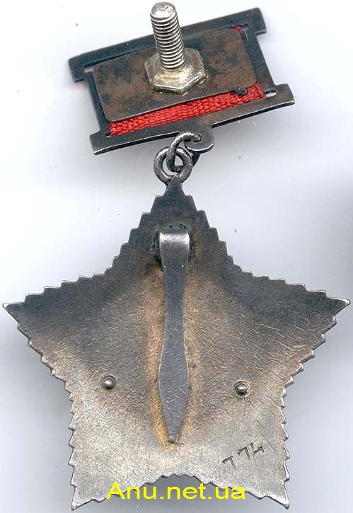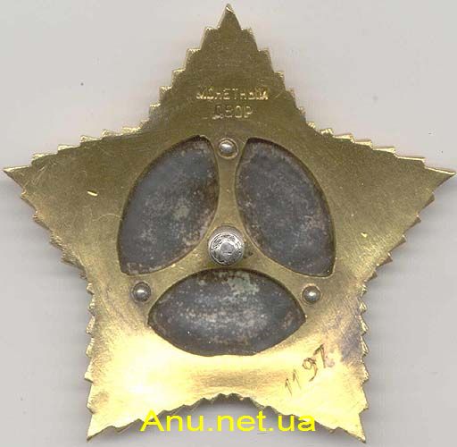 - Вариант 3. Центральный медальон не является отдельным элементом и выполнен заодно с пятиконечной звездой. На реверсе имеется углубление правильной округлой формы. Заклепки на реверсе отсутствуют. Ушко в верхнем луче звезды также не является отдельной деталью, а представляет одно целое с верхним лучом звезды. Единственный известный номер ордена – 1604. На данный момент мы не располагаем изображениями этого варианта.